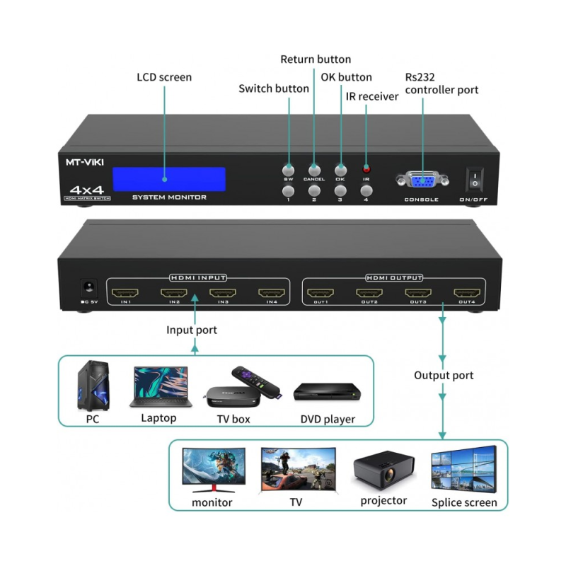 - Trois modes de commutation: RS232, bouton de panneau, télécommande IR. Construit avec un écran LCD pour un fonctionnement clair. Soutenir la gestion EDID.