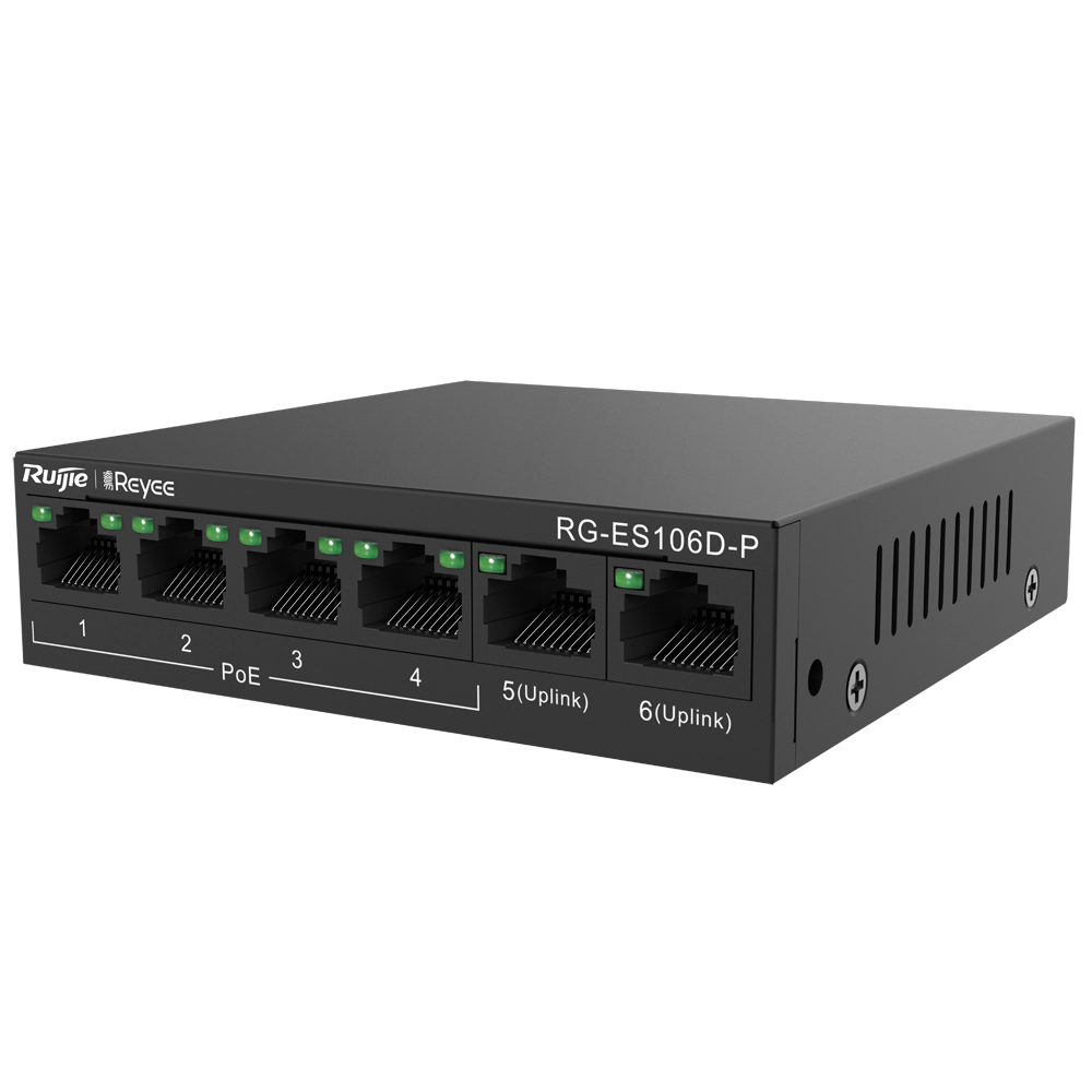 Ruijie RG-ES106D-P - Switch de Bureau 6 Ports RJ45 10/100Mbps 4 Ports PoE+ 802.3af/at 2 Ports Uplink Puissance PoE Totale 58W